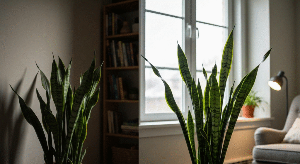 | Snake Plant ‘B’ | Same room (dark corner) | Smart Plug + 6W LED bulb (8 hrs/day) | Pushed out two new, strong leaves. Color looks deeper. |