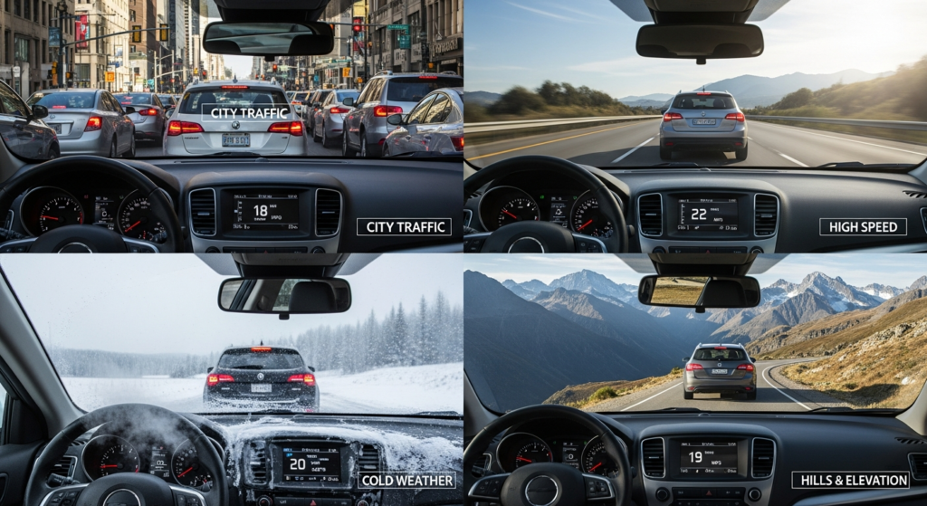 Adjusted estimate: 26 MPG × 0.80 (cold climate) × 0.90 (moderate speeds) = 18.7 MPG