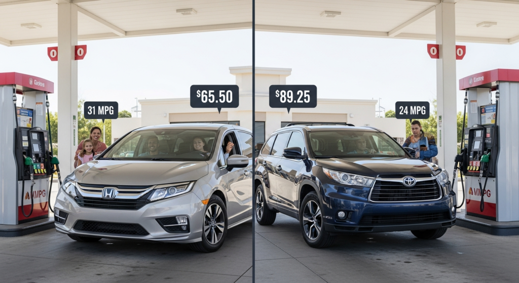 Here’s what nobody tells you: those SUV prices escalate fast. A Honda Odyssey EX-L (which most families find perfect) runs about $43,000. The comparable Honda Pilot in Touring trim? You’re looking at $51,000. That’s an $8,000 gap before you even talk financing.