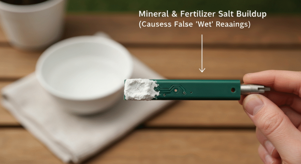 - Why it tricks the sensor: These salts build up on the sensor probes as a white, crusty film. This film is highly conductive. Your sensor works by passing a tiny electrical current through the soil—more water equals more conductivity, which equals a “wet” reading. But a crust of fertilizer salts is also highly conductive.